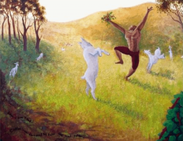 Ele descobriu que a fonte da excitação era um pequeno arbusto com frutos vermelhos brilhantes. Ele ficou extremamente curioso e comeu as frutas. Como as cabras, Kaldi sentiu os efeitos energizantes das cerejas de café. Depois de encher os bolsos com as frutas vermelhas, ele correu para sua esposa em casa, e ela o aconselhou a ir ao mosteiro próximo a fim de compartilhar esses frutos “enviados do céu” com os monges. Ao chegar ao mosteiro, os grãos de café de Kaldi não foram saudados com alegria, mas com desdém.